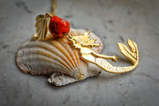 Ciondolo sirena media e catenina in argento placcato oro 23ct con corallo naturale. Disponibile in argento placcato oro giallo e bianco.
