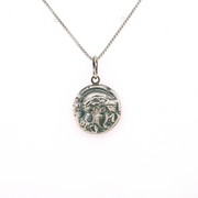 Ciondolo in argento brunito e argento placcato oro riproducente una moneta dell'antica Nuceria Alfatema, una città della Campania corrispondente all'attuale Nocera Superiore, che prima del 200 a.c rappresentava la città più importante della zona.