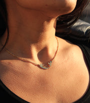 Il nostro girocollo Sirena è in argento placcato oro 23kt e impreziosito da uno smeraldo naturale nell’occhio di 0,01Ct.